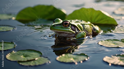 Green Frog Resting on Water Lilies in Natural Pond Scene