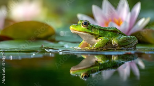 Green frog sitting on a lily pad in a pond with a pink water lily in the background in soft light