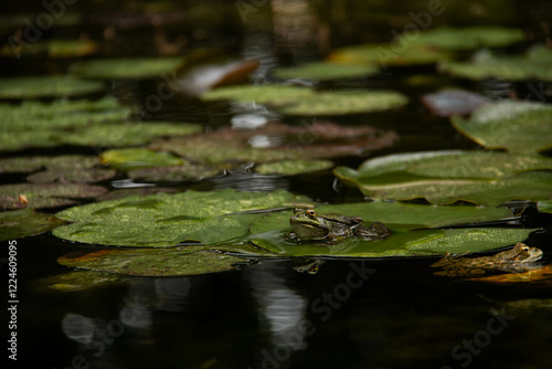 Green frogs resting on Spring large Leaves of lilypads in Serene environment of a pond surrounded by reflections of water and natural foliage. Peaceful atmosphere of freshwater amphibian habitat