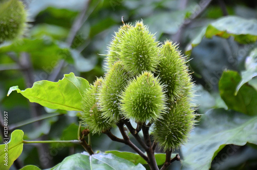 Green fruits of annatto (Bixa orellana) growing in the backyard on a sunny day