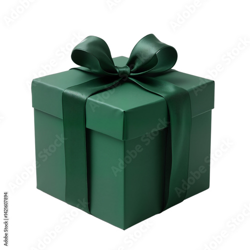 gift, box, green, ribbon, present, birthday, christmas, february 14, mother's day, surprise, package, celebration, holiday, design, element, square, satin, bow, elegant, dark green, matte, texture, smooth, reflective, luxury, sophistication, centered, studio, lighting, promotional, campaign, isolated