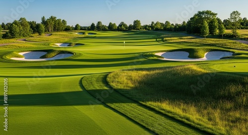 Green golf course landscape with bunkers and trees under clear blue sky