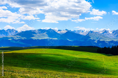 Green grass and mountain with blue sky background.Green grassland landscape in Xinjiang,China.