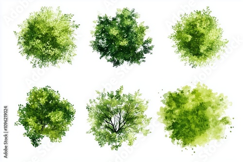 green grass isolated on white background, Set of watercolor tree top view for landscape plan and architecture layout