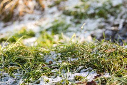 Green grass with snow and fallen leaves in the park. Picture of three seasons - summer, autumn and winter. Sunny day background