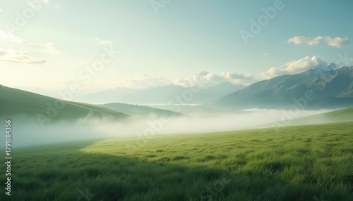 Green grassy hills stretch towards misty mountains under soft sky. Gentle fog blankets lower slopes creating tranquil natural panorama. Sunlight breaks through, illuminating vast open fields in early