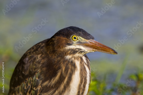 Green heron close up on edge of pond in green plants