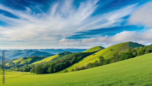 landscape, nature, sky, cloud, green, blue, hill, grass, tree, scenery, vista, rolling, vibrant, breathtaking, beautiful, idylli, serene, peaceful, tranquil, summer, spring, daytime, sunny, environment, natural, meadow, pasture, field, vale, mountain, range, horizon, perspective, panoramic, wide, scenic, picturesque, rural, countryside, agriculture, farming, ecology, ecosystem, conservation, sustainability, travel, tour tourism, destination