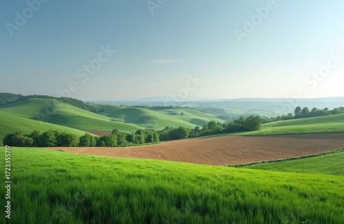 Green hills, plowed fields in valley on sunny day. Trees in background. Beautiful tranquil rural scene with agriculture, grass meadow, sky and horizon in summer season.