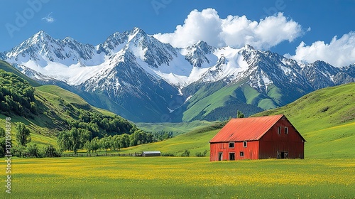 Green hills, snow capped mountains, a barn, a picturesque landscape.