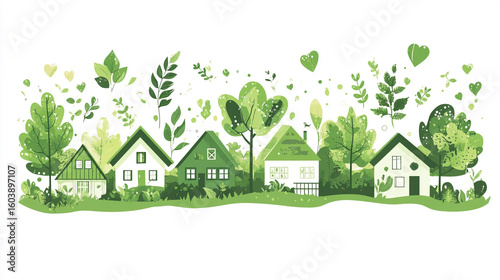 house, home, nature, green, tree, leaf, plant, foliage, eco, friendly, environment, village, landscape, residential, community, suburb, scene, illustration, graphic, design, art, artwork, peaceful, serene, harmony, bungalow, home, building, architecture, sustainable, living, spring, summer, nubes, love, idylli, botanical