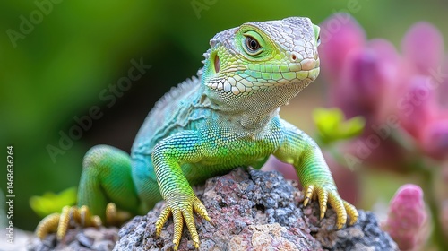Green Iguana Close Up on Gray Rock Amidst Pink Flowers and Greenery Wildlife Detailed Scales and Vibrant Colors