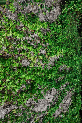 Green ivy has grown on the concrete wall. Textured background image for your creative design or illustrations about nature.