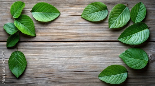 Green leaves arranged on wooden surface.