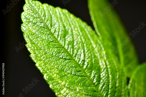 Green leaves of rose bush on black background.