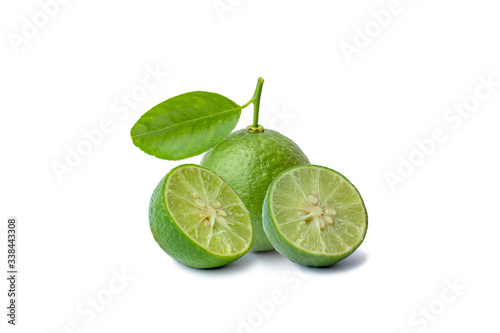 Green lemons with lemon slices and halves on a white background with the clipping path.