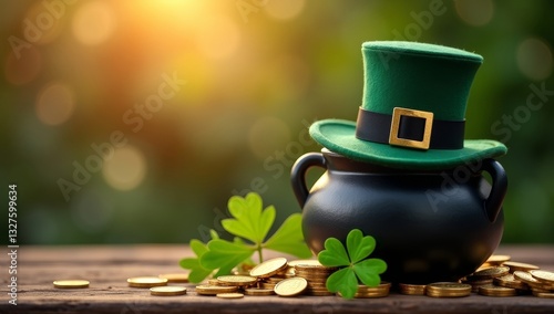 Green leprechaun hat sits atop a pot of gold surrounded by shamrock leaves during a sunny spring afternoon, St. Patrick's Day