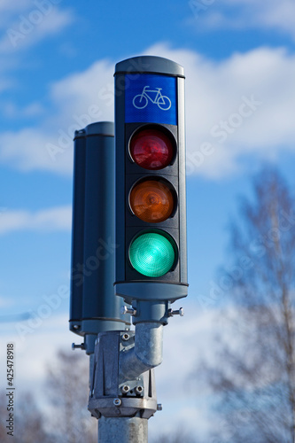 object, priority, intersection, stoplight, blue skies, sweden, go, copy space, electric, outdoors, day, technology, bicyclist, pedestrian, silhouette, regulation, order, pole, rule, isolated, transport, cycling, bicycle, bicyclist, bike, crossroad, control, yellow, way, lamp, danger, semaphore, stop, warning, colours, safety, signs, concept, symbol, urban, red, city, road, street, light, signal, green, traffic