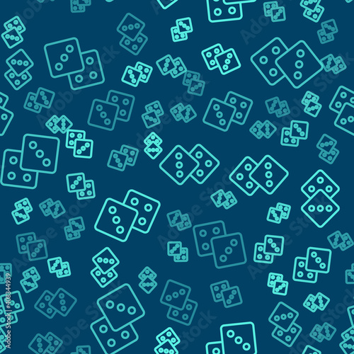Green line Game dice icon isolated seamless pattern on blue background. Casino gambling. Vector.