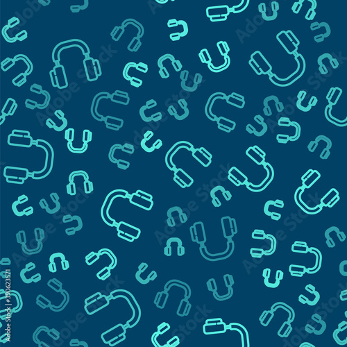 Green line Headphones icon isolated seamless pattern on blue background. Earphones. Concept for listening to music, service, communication and operator. Vector.