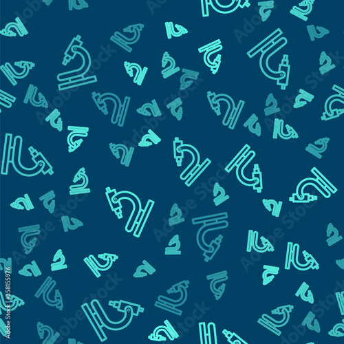 Green line Microscope icon isolated seamless pattern on blue background. Chemistry, pharmaceutical instrument, microbiology magnifying tool. Vector Illustration