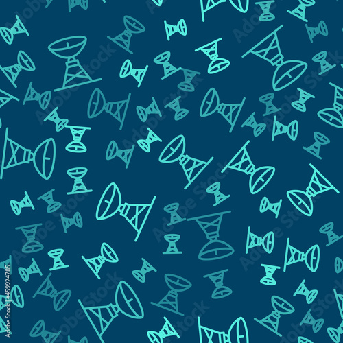 Green line Satellite dish icon isolated seamless pattern on blue background. Radio antenna, astronomy and space research. Vector