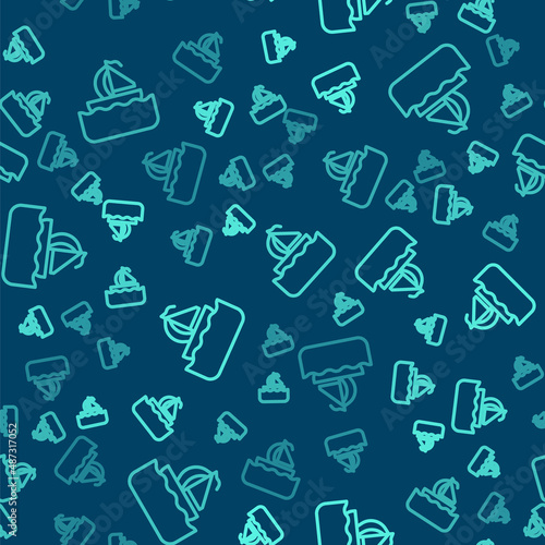 Green line Yacht sailboat or sailing ship icon isolated seamless pattern on blue background. Sail boat marine cruise travel. Vector
