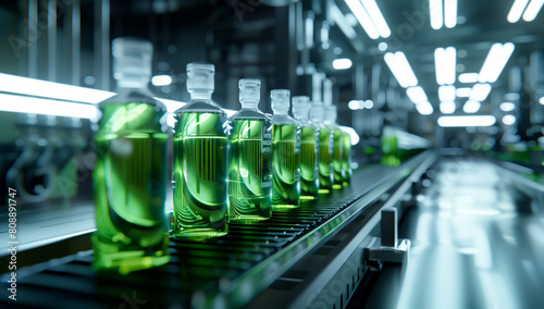 Green liquid in bottles on a conveyor belt at a production line of a beauty product factory, 3D rendering, wide angle lens. The scene shows green liquid in bottles on a conveyor belt at a production l