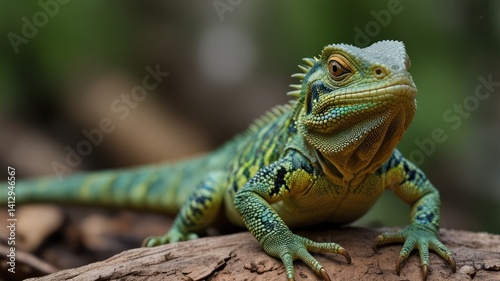lizzard, green, reptile, wildlife, nature, animal, forest, log, closeup, dragon, exotic, scaly, wild, creature, background, macro, tropical, pet, iguana, scale, skin, eye, head, tail, fauna, flora, jungle, park, garden, outdoors, photo, image, picture, stock, photo, vertebrate, herpetology, biology, zoology, earth