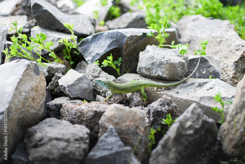 Green lizard on rocky terrain at Emerald Lake in Racos, Romania