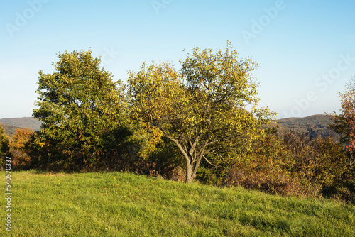Green meadow on a sunny day in autumn.Colorful trees in background.