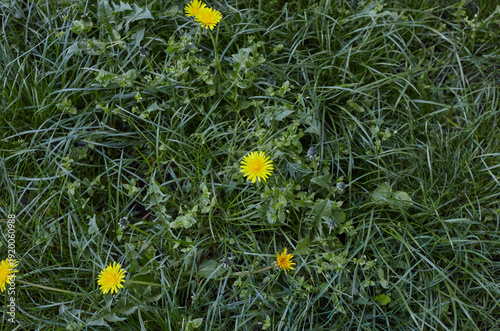 Green meadow with yellow dandelions in spring. Closeup of yellow spring flowers on the ground