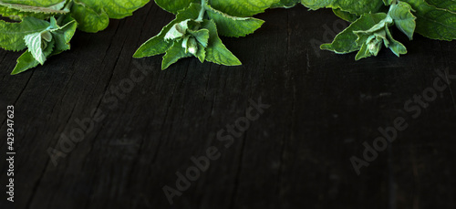 green mint leaves on a black wooden background