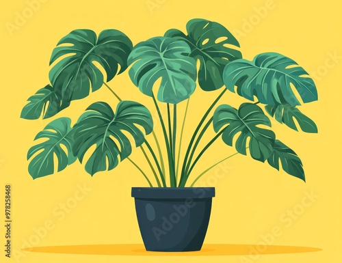 leaf, home decor, illustration, indoor plant, green leaf, houseplant, potted plants, leafy, nature, yellow background, foliage, greenery, green plant, flora