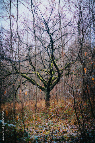 green mossy tree in autumn forest