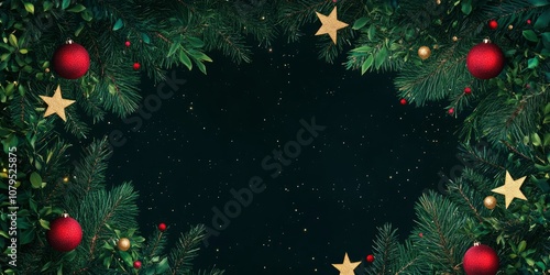 Green oak tree branches with red christmas balls and golden stars on the two sides. , copy space, ai