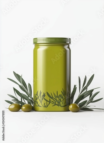 Green olive jar on white background with olive branches, organic pickled olives in glass container, Mediterranean food product packaging and healthy snack retail concept.