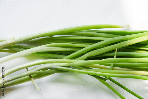 Green onions with bulbs on a white background.
