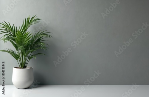 Green palm plant in white pot stands on white table. Gray wall background provides copy space for advertising. Interior design, room decor for home or office, living room. Nobody.