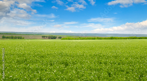 Green pea field and blue sky. Wide photo.