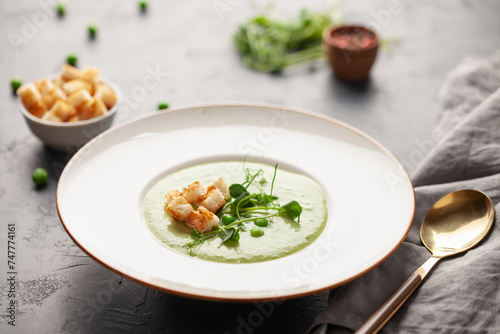 Green peas cream soup in plate. Summer vegetable food