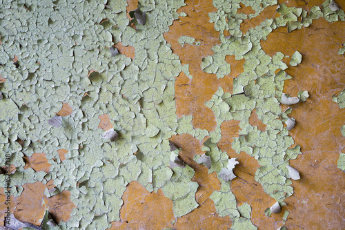 green peeling paint on orange wall