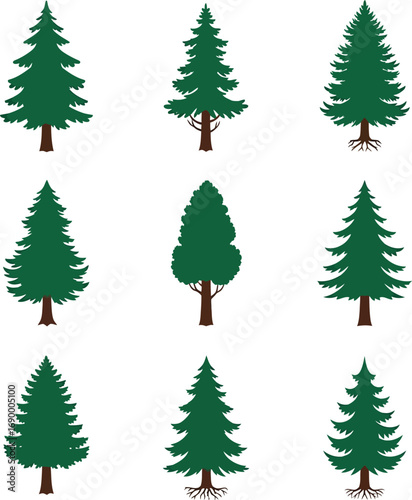 Green Pine Tree Icons Set, Nine Conifer Silhouettes