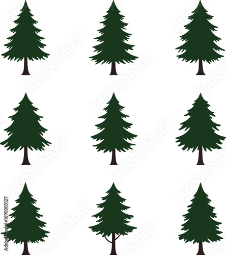 Green Pine Tree Icons Set, Nine Conifer Silhouettes