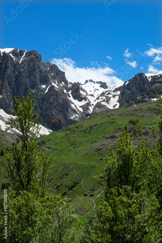 Green plains, snowy mountains. Blue sky and snowy mountains. Snowy mountains of Tunceli. Pülümür Valley, Buyer Mountain, Sarıgül Plateau, Buyer Waterfall.Munzur, Tunceli, Türkiye.