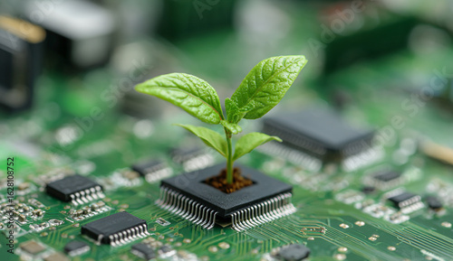 Green Plant Growing on Electronic Circuit Board – Symbol of Sustainable Technology Integration