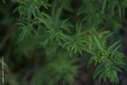 green plant leaves with pointed shapes, captured in macro photography. Soft blurred background with natural bokeh effect creates a fresh and organic look. Perfect for botanical, eco, and nature-relate