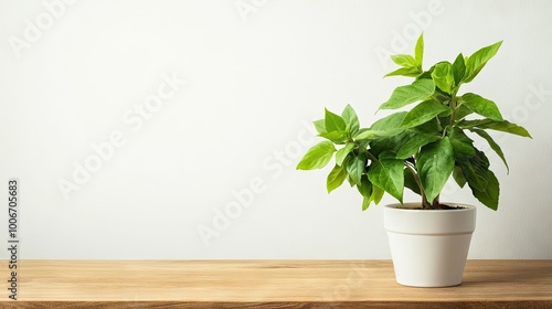 Green plant on a wooden desk with a clean white background, offering space for messages or branding.