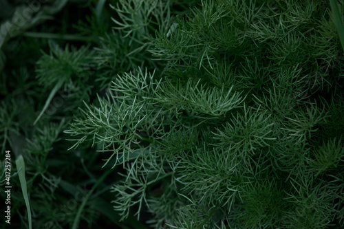 green plant shrubs with soft blurring as the background, a Bush with tiny needle-like leaves in the garden