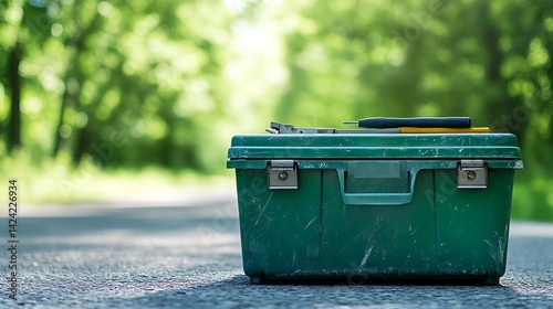 Green plastic tool box on the road in the forest, selective focus